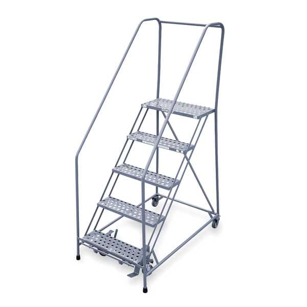 Rolling Ladder, Material Steel, Platform Height 4.2 ft, Handrails Included Yes, Handrail Height 2.5 ft, Overall Height 6.7 ft, Number of Steps 5, Assembled, Load Capacity 450 lb, Step Tread Serrated, Platform Depth 24 in, Platform Width 24 in, Bottom Width 30 in, Base Depth 63 in, Overall Width 30 in, Climbing Angle 50 Degrees , Step Depth 7 in, Step Width 24 in, Ladder Actuation Foot Activated Step Lock, Finish Powder Coated, Color Gray, Standards ANSI, OSHA Compliant, Includes 1 in Crutch Tips