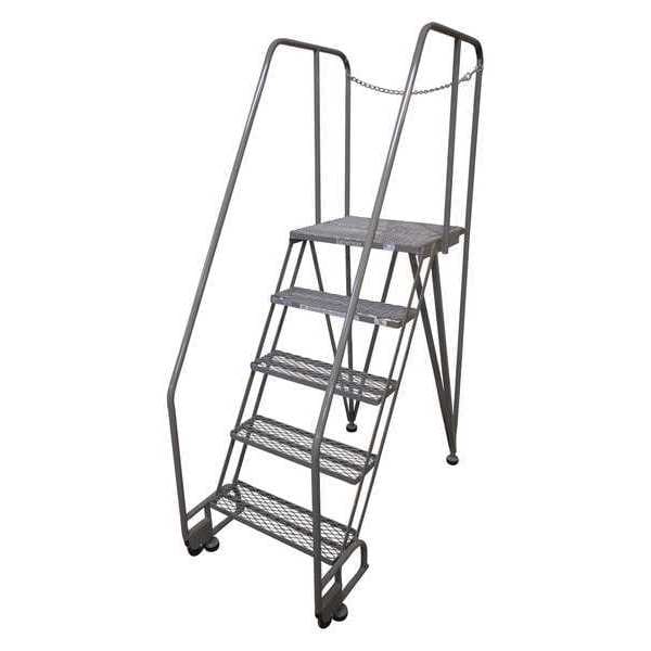 Tilt and Roll Ladder, Material Steel, Platform Height 4.2 ft, Handrails Included Yes, Handrail Height 2.5 ft, Overall Height 6.7 ft, Number of Steps 5, Assembled, Load Capacity 350 lb, Step Tread Expanded Metal, Platform Depth 20 in, Platform Width 24 in, Bottom Width 28 in, Base Depth 43 in, Overall Width 28 in, Climbing Angle 59 Degrees , Step Depth 7 in, Step Width 24 in, Ladder Actuation None, Finish Powder Coated, Color Gray, Standards ANSI, OSHA Compliant, Rear Exit Yes