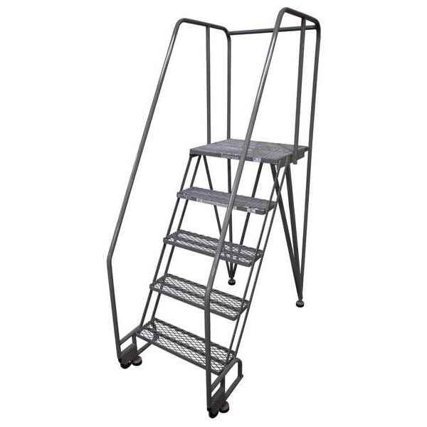 Tilt and Roll Ladder, Material Steel, Platform Height 4.2 ft, Handrails Included Yes, Handrail Height 2.5 ft, Overall Height 6.7 ft, Number of Steps 5, Assembled, Load Capacity 350 lb, Step Tread Expanded Metal, Platform Depth 20 in, Platform Width 24 in, Bottom Width 28 in, Base Depth 54 in, Overall Width 28 in, Climbing Angle 59 Degrees , Step Depth 7 in, Step Width 24 in, Ladder Actuation None, Finish Powder Coated, Color Gray, Standards ANSI, OSHA Compliant, Includes Double Handrails