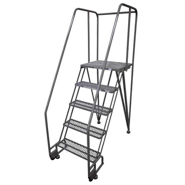 Tilt and Roll Ladder, Material Steel, Platform Height 4.2 ft, Handrails Included Yes, Handrail Height 2.5 ft, Overall Height 6.7 ft, Number of Steps 5, Assembled, Load Capacity 350 lb, Step Tread Serrated, Platform Depth 20 in, Platform Width 24 in, Bottom Width 28 in, Base Depth 54 in, Overall Width 28 in, Climbing Angle 59 Degrees , Step Depth 7 in, Step Width 24 in, Ladder Actuation None, Finish Powder Coated, Color Gray, Standards ANSI, OSHA Compliant, Includes Double Handrails, Rear Exit No