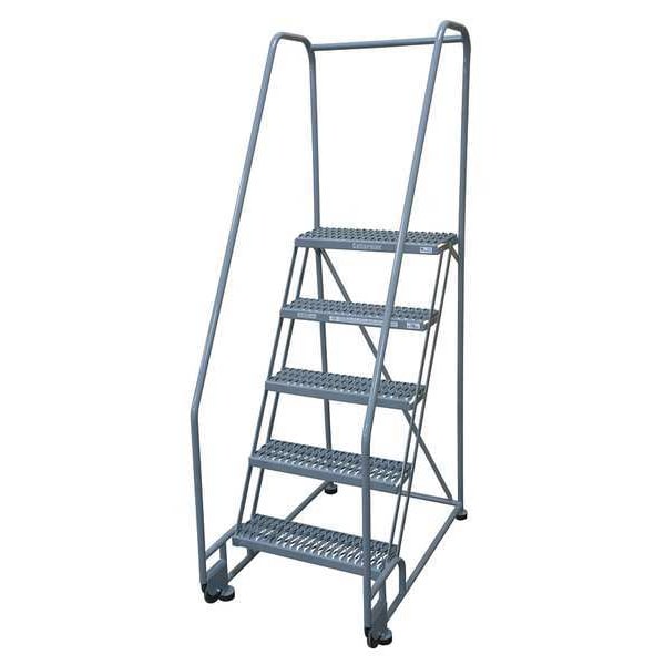 Tilt and Roll Ladder, Material Steel, Platform Height 4.2 ft, Handrails Included Yes, Handrail Height 2.5 ft, Overall Height 6.7 ft, Number of Steps 5, Assembled, Load Capacity 450 lb, Step Tread Serrated, Platform Depth 10 in, Platform Width 24 in, Bottom Width 28 in, Base Depth 43 in, Overall Width 28 in, Climbing Angle 59 Degrees , Step Depth 7 in, Step Width 24 in, Ladder Actuation None, Finish Powder Coated, Color Gray, Standards ANSI, OSHA Compliant, Includes 2-1/2 in Rubber Pads