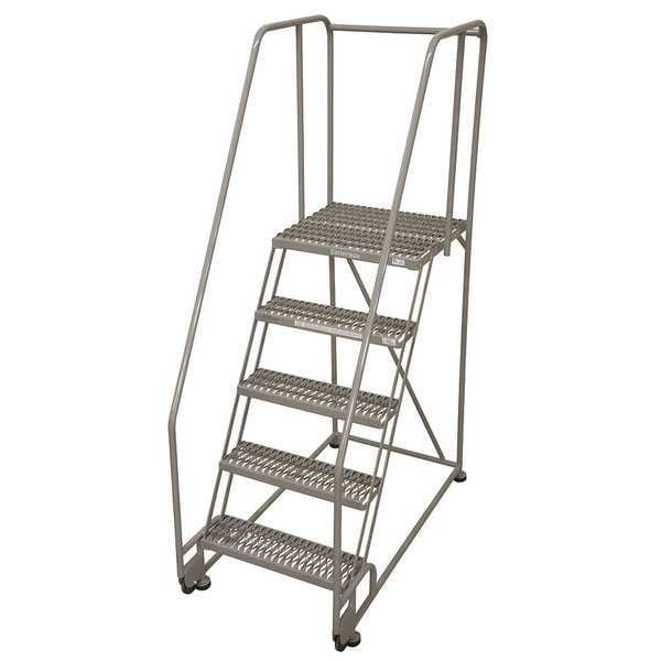 Tilt and Roll Ladder, Material Steel, Platform Height 4.2 ft, Handrails Included Yes, Handrail Height 2.5 ft, Overall Height 6.7 ft, Number of Steps 5, Assembled, Load Capacity 450 lb, Step Tread Serrated, Platform Depth 20 in, Platform Width 24 in, Bottom Width 28 in, Base Depth 54 in, Overall Width 28 in, Climbing Angle 59 Degrees , Step Depth 7 in, Step Width 24 in, Ladder Actuation None, Finish Powder Coated, Color Gray, Standards ANSI, OSHA Compliant, Includes 2-1/2 in Rubber Pads