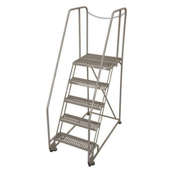 Tilt and Roll Ladder, Material Steel, Platform Height 4.2 ft, Handrails Included Yes, Handrail Height 2.5 ft, Overall Height 6.7 ft, Number of Steps 5, Assembled, Load Capacity 450 lb, Step Tread Serrated, Platform Depth 20 in, Platform Width 24 in, Bottom Width 28 in, Base Depth 54 in, Overall Width 28 in, Climbing Angle 59 Degrees , Step Depth 7 in, Step Width 24 in, Ladder Actuation None, Finish Powder Coated, Color Gray, Standards ANSI, OSHA Compliant, Includes Removable Rear Chain