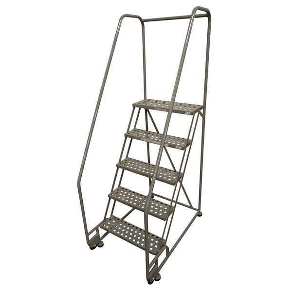 Tilt and Roll Ladder, Material Steel, Platform Height 4.2 ft, Handrails Included Yes, Handrail Height 2.5 ft, Overall Height 6.7 ft, Number of Steps 5, Assembled, Load Capacity 450 lb, Step Tread Perforated, Platform Depth 10 in, Platform Width 24 in, Bottom Width 28 in, Base Depth 43 in, Overall Width 28 in, Climbing Angle 59 Degrees , Step Depth 7 in, Step Width 24 in, Ladder Actuation None, Finish Powder Coated, Color Gray, Standards ANSI, OSHA Compliant, Includes 2-1/2 in Rubber Pads