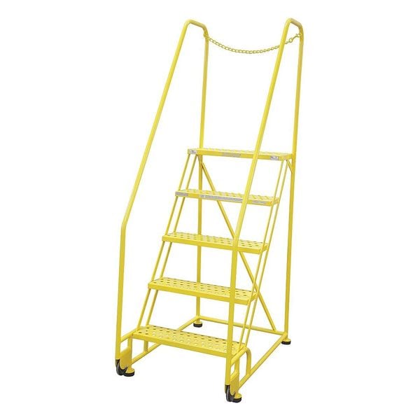 Tilt and Roll Ladder, Material Steel, Platform Height 4.2 ft, Handrails Included Yes, Handrail Height 2.5 ft, Overall Height 6.7 ft, Number of Steps 5, Assembled, Load Capacity 450 lb, Step Tread Perforated, Platform Depth 10 in, Platform Width 24 in, Bottom Width 28 in, Base Depth 43 in, Overall Width 28 in, Climbing Angle 59 Degrees , Step Depth 7 in, Step Width 24 in, Ladder Actuation None, Finish Powder Coated, Color Yellow, Standards ANSI, OSHA Compliant
