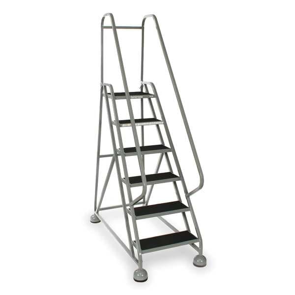 Rolling Ladder, Material Steel, Platform Height 4.5 ft, Handrails Included Yes, Handrail Height 2.5 ft, Overall Height 7 ft, Number of Steps 6, Unassembled, Load Capacity 450 lb, Step Tread Antislip Vinyl, Platform Depth 8 in, Platform Width 16 in, Bottom Width 27 in, Base Depth 48 in, Overall Width 27 in, Climbing Angle 56 Degrees , Step Depth 8 in, Step Width 16 in, Ladder Actuation Weight Activated Step Lock, Finish Powder Coated, Color Gray, Standards ANSI, OSHA Compliant