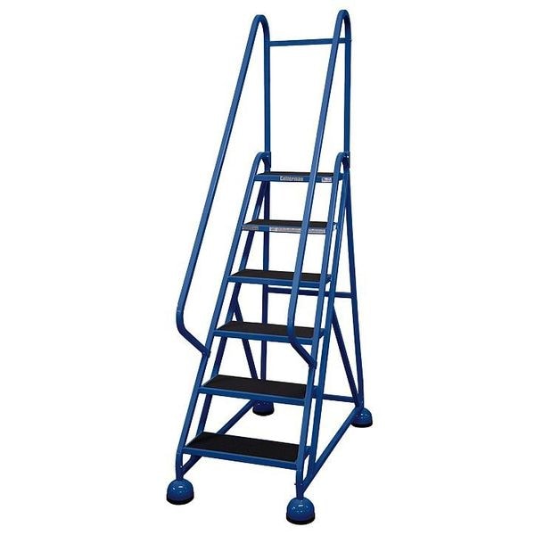 Rolling Ladder, Material Steel, Platform Height 4.5 ft, Handrails Included Yes, Handrail Height 2.5 ft, Overall Height 7 ft, Number of Steps 6, Unassembled, Load Capacity 450 lb, Step Tread Antislip Vinyl, Platform Depth 8 in, Platform Width 16 in, Bottom Width 27 in, Base Depth 48 in, Overall Width 27 in, Climbing Angle 56 Degrees , Step Depth 8 in, Step Width 16 in, Ladder Actuation Weight Activated Step Lock, Finish Powder Coated, Color Blue, Standards ANSI, OSHA Compliant