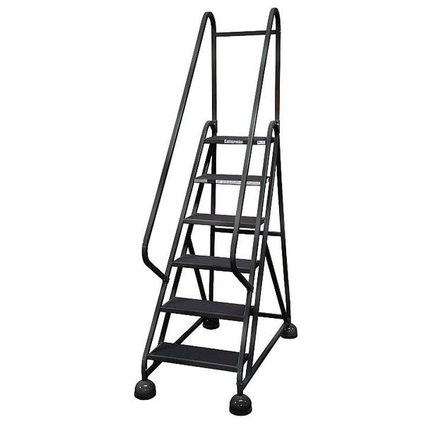 Rolling Ladder, Material Steel, Platform Height 4.5 ft, Handrails Included Yes, Handrail Height 2.5 ft, Overall Height 7 ft, Number of Steps 6, Unassembled, Load Capacity 450 lb, Step Tread Antislip Vinyl, Platform Depth 8 in, Platform Width 16 in, Bottom Width 27 in, Base Depth 48 in, Overall Width 27 in, Climbing Angle 56 Degrees , Step Depth 8 in, Step Width 16 in, Ladder Actuation Weight Activated Step Lock, Finish Powder Coated, Color Black, Standards ANSI, OSHA Compliant
