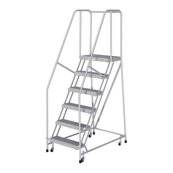 Rolling Ladder, Material Aluminum, Platform Height 5 ft, Handrails Included Yes, Handrail Height 2.5 ft, Overall Height 7.5 ft, Number of Steps 6, Assembled, Load Capacity 350 lb, Step Tread Ribbed, Platform Depth 14 in, Platform Width 24 in, Bottom Width 30 in, Base Depth 50 in, Overall Width 30 in, Climbing Angle 59 Degrees , Step Depth 7 in, Step Width 24 in, Ladder Actuation Weight Activated Step Lock, Finish Aluminum Acid Brightened, Color Gray, Standards ANSI, OSHA Compliant, Rear Exit No