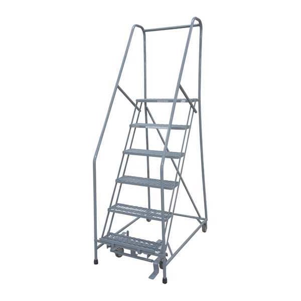 Rolling Ladder, Material Steel, Platform Height 5 ft, Handrails Included Yes, Handrail Height 2.5 ft, Overall Height 7.5 ft, Number of Steps 6, Assembled, Load Capacity 450 lb, Step Tread Expanded Metal, Platform Depth 10 in, Platform Width 30 in, Bottom Width 32 in, Base Depth 46 in, Overall Width 32 in, Climbing Angle 59 Degrees , Step Depth 7 in, Step Width 30 in, Ladder Actuation Foot Activated Step Lock, Finish Powder Coated, Color Gray, Standards ANSI, OSHA Compliant, Rear Exit No