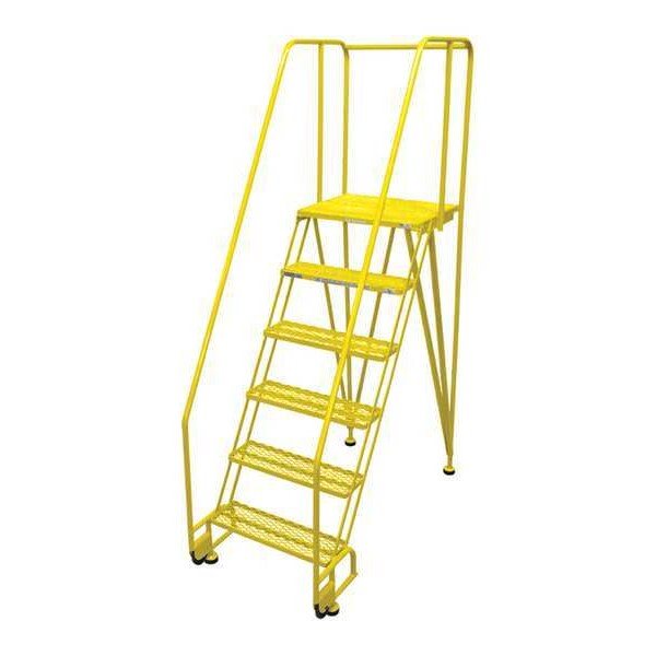 Tilt and Roll Ladder, Material Steel, Platform Height 5 ft, Handrails Included Yes, Handrail Height 2.5 ft, Overall Height 7.5 ft, Number of Steps 6, Assembled, Load Capacity 350 lb, Step Tread Serrated, Platform Depth 20 in, Platform Width 24 in, Bottom Width 28 in, Base Depth 49 in, Overall Width 28 in, Climbing Angle 59 Degrees , Step Depth 7 in, Step Width 24 in, Ladder Actuation None, Finish Powder Coated, Color Yellow, Standards ANSI, OSHA Compliant, Rear Exit No