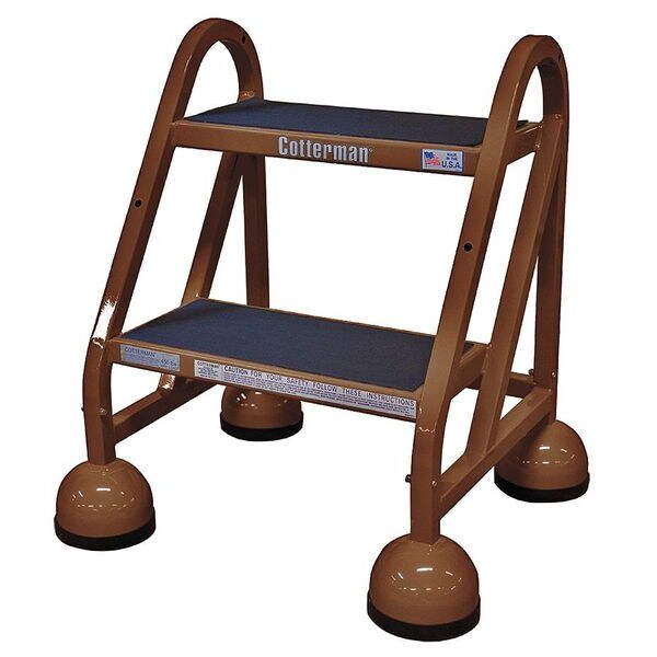 Step Stool Product Group Rolling Step, Number of Steps 2, Overall Height 22 in, Material Steel, Load Capacity 450 lb, Top Step Height 18 in, Top Step Depth 8 in, Bottom Width 22 in, Base Depth 26 in, Color Brown, Finish Powder Coated, Standards OSHA 1910.29 and ANSI A14.7, Ladder Actuation Spring-Loaded Casters, Step Tread Rubber Mat, Step Width 16 in
