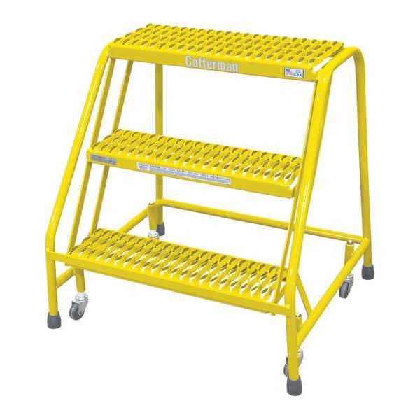 Step Stool Product Group Rolling Step, Number of Steps 3, Overall Height 30 in, Material Steel, Load Capacity 450 lb, Top Step Height 30 in, Top Step Depth 7 in, Bottom Width 30 in, Base Depth 46 in, Color Gray, Finish Powder Coated, Standards OSHA 1910.29 and ANSI A14.7, Ladder Actuation Spring-Loaded Casters, Step Tread Serrated, Step Width 24 in