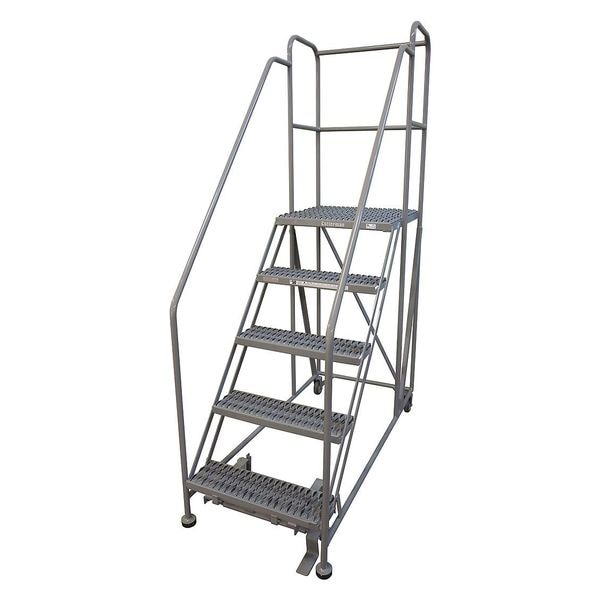 Single Access Rolling Platform, Material Steel, Platform Style Single Access, Platform Height 50 in, Load Capacity 800 lb, Number of Modular Decks 1, Base Depth 106 in, Bottom Width 28 in, Platform Depth 72 in, Platform Width 24 in, Overall Height 7 ft 2 in, Handrail Height 3 ft, Number of Guard Rails 3, Number of Legs 2, Number of Steps 5, Step Width 24 in, Step Depth 7 in, Climbing Angle 50 Degrees , Step Tread Serrated, Color Gray, Finish Powder Coated, Standards ANSI, OSHA Compliant
