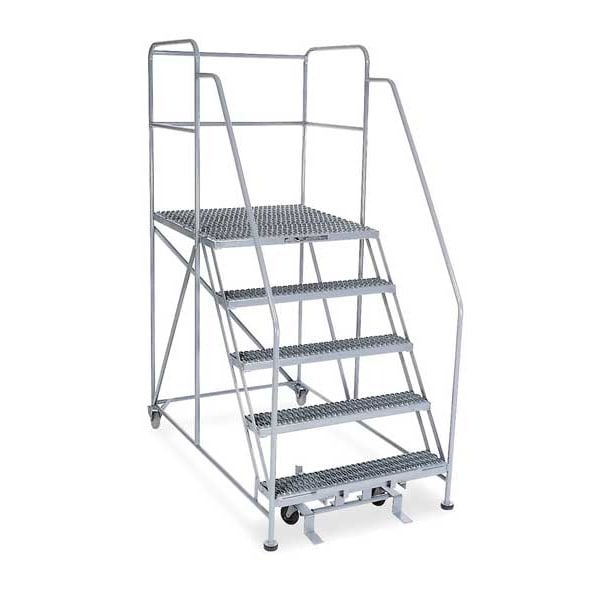 Single Access Rolling Platform, Material Steel, Platform Style Single Access, Platform Height 50 in, Load Capacity 800 lb, Base Depth 82 in, Bottom Width 40 in, Platform Depth 48 in, Platform Width 36 in, Overall Height 7 ft 2 in, Handrail Height 3 ft, Number of Guard Rails 3, Number of Legs 2, Number of Steps 5, Step Width 36 in, Step Depth 7 in, Climbing Angle 50 Degrees , Step Tread Serrated, Color Gray, Finish Powder Coated, Standards ANSI, OSHA Compliant, Includes 2-1/2 in Rubber Pads
