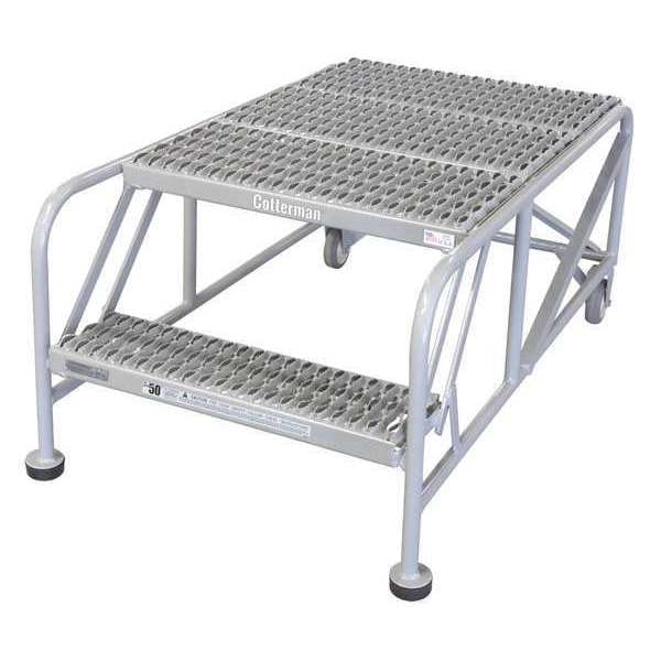 Single Access Rolling Platform, Material Steel, Platform Style Single Access, Platform Height 20 in, Load Capacity 800 lb, Base Depth 34 in, Bottom Width 28 in, Platform Depth 24 in, Platform Width 24 in, Overall Height 1 ft 8 in, Handrail Height Not Applicable, Number of Legs 2, Number of Steps 2, Step Width 24 in, Step Depth 7 in, Climbing Angle 50 Degrees , Step Tread Serrated, Color Gray, Finish Powder Coated, Standards OSHA Compliant, Includes 2-1/2 in Rubber Pads, Handrails Included No