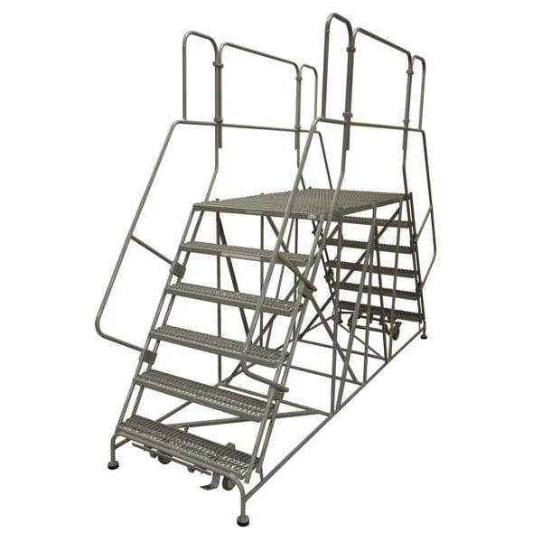 Dual Access Rolling Platform, Material Steel, Platform Style Dual Access, Platform Height 70 in, Load Capacity 800 lb, Base Depth 147 in, Bottom Width 40 in, Platform Depth 72 in, Platform Width 36 in, Overall Height 8 ft 10 in, Handrail Height 3 ft, Number of Guard Rails 6, Number of Legs 4, Number of Steps 7, Step Width 36 in, Step Depth 7 in, Climbing Angle 59 Degrees , Step Tread Serrated, Color Gray, Finish Powder Coated, Standards ANSI, OSHA Compliant, Includes 2-1/2 in Rubber Pads