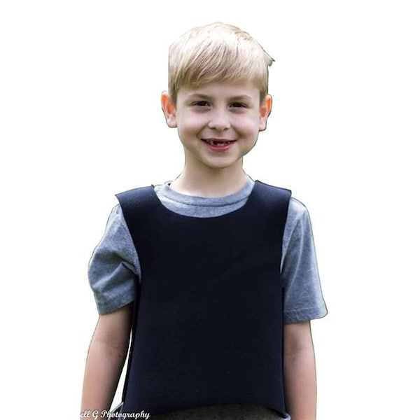 Covered In Comfort Compression Vest is designed to provide constant, even pressure to children with autism, sensory processing disorders, hyperactivity and more. Deep pressure input is similar to the sensation of being hugged and can provide a calming effect, provide focus and give a greater sense of body awareness. Constructed of soft 2mm neoprene. Side cloth hook and eye closures adjust to any body type. Use with supervision for 20 minutes at a time or as recommended. Small Vest measures 15 W x 13 L inches.