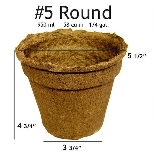 CowPots are 'the pots you plant' making it even easier for you to start your own garden. Made from composted cow manure CowPots are 100% biodegradable renewable and are an all-natural alternative to start your seeds. Transplanting is easy just place the whole pot in the ground (no need to crush or tear the pot walls) eliminating transplant shock. This product is on a Connecticut family dairy is plastic and peat free. The most sustainable biodegradable pot on the market. #5 ROUNDUses: Great for transplanting of ornamental peppers small mums and perennial herbs. Shape makes this pot easy to incorporate into indoor/decorative planting containers as well. Also a good size for setting up bulbs mid-winter.The larger pot size maintains ability to rapidly decompose once planted.Shelf life: Once planted the #5 round stays intact for 3 to 4 months in a greenhouse setting.If not planted and kept in a cool dry location shelf life is indefinite (a dry location is critical).Volume : 950 mL/cell - 65 cu inDimensions : 5 1/2” x 3 3/4” x 4 3/4”Fits Carrier Tray : Dillen VTA 558 - Fits: 8 pots/tray