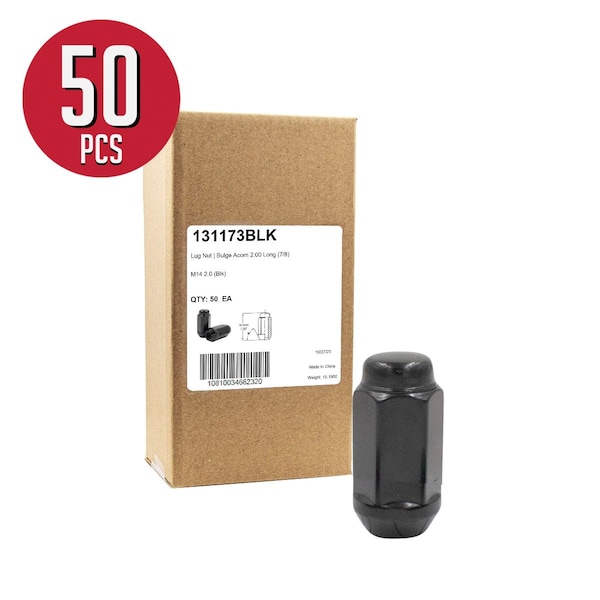 14 mm x 2 Thread Size; 60 Degree Conical Bulge; Acorn; 2 Inch Overall Length; 7/8 Inch Lug Nut Hex Size; Black; Carbon Steel; Box Of 50