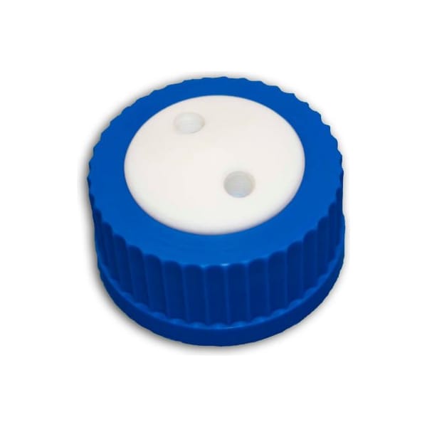 port cap with 2 ports (1/4-28), ptfe insert, and blue polypropylene collar. Fits glass bottles with a gl45 neck size. Comes with plugs. Choose tubing adapters (not included) based on your tubing size. A set of plugs in included for each port you do not wish to use.