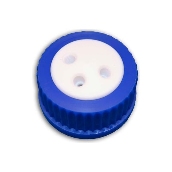 port cap with 3 ports (1/4-28), ptfe insert, and blue polypropylene collar. Fits glass bottles with a gl45 neck size. Comes with plugs. Choose tubing adapters (not included) based on your tubing size. A set of plugs in included for each port you do not wish to use.