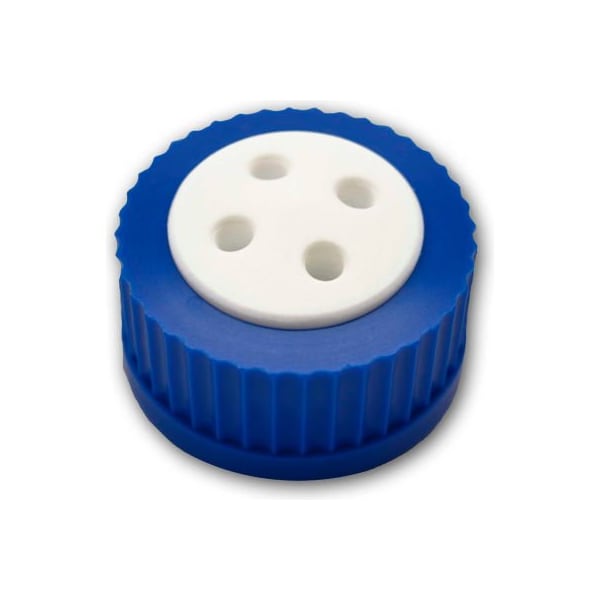 port cap with 4 ports (1/4-28), ptfe insert, and blue polypropylene collar. Fits glass bottles with a gl45 neck size. Comes with plugs. Choose tubing adapters (not included) based on your tubing size. A set of plugs in included for each port you do not wish to use.