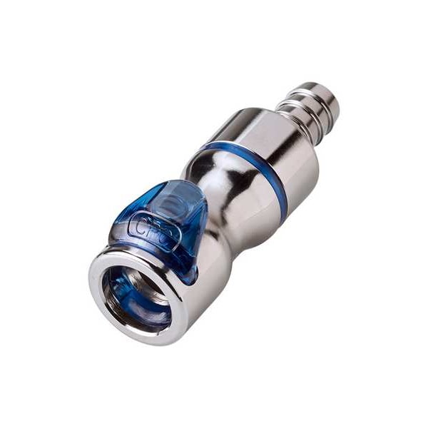 Quick Connection Coupling, Application Dielectric Coolants, Glycol/Water Coolants, Fitting Side A Connection Type Coupler, Fitting Side B Connection Type Barbed, Fitting Side B Tube Inner Diameter 3/8 in, Flow Control Type Shut-off, Fitting Material Brass, Overall Length 2 1/2 in, Specific Fitting Shape Straight Coupler, Finish/Coating Chrome, Material Grade CA360, Standards REACH, RoHS, Color Cool Blue, Compatible Tube Hardness Not Applicable, Compatible Tube Material Not Applicable