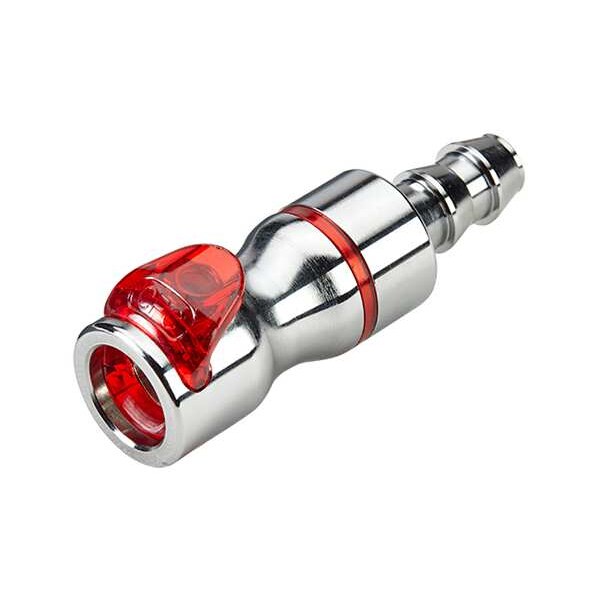 Quick Connection Coupling, Application Dielectric Coolants, Glycol/Water Coolants, Fitting Side A Connection Type Coupler, Fitting Side B Connection Type Barbed, Fitting Side B Tube Inner Diameter 3/8 in, Flow Control Type Shut-off, Fitting Material Brass, Overall Length 2 11/16 in, Specific Fitting Shape Straight Coupler, Finish/Coating Chrome, Material Grade CA360, Standards REACH, RoHS, Color Warm Red, Compatible Tube Hardness Not Applicable, Compatible Tube Material Not Applicable