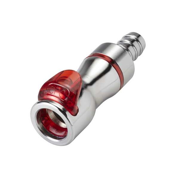 Quick Connection Coupling, Application Dielectric Coolants, Glycol/Water Coolants, Fitting Side A Connection Type Coupler, Fitting Side B Connection Type Barbed, Fitting Side B Tube Inner Diameter 3/8 in, Flow Control Type Shut-off, Fitting Material Brass, Overall Length 2 11/16 in, Specific Fitting Shape Straight Coupler, Finish/Coating Chrome, Material Grade CA360, Standards REACH, RoHS, Color Warm Red, Compatible Tube Hardness Not Applicable, Compatible Tube Material Not Applicable