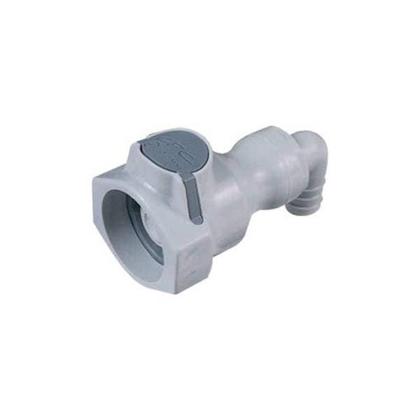 Quick Connection Coupling, Application Chemical, Fitting Side A Connection Type Coupler, Fitting Side B Connection Type Barbed, Fitting Side B Tube Inner Diameter 1/2 in, Flow Control Type Shut-off, Fitting Material Polypropylene, Overall Length 3 1/4 in, Specific Fitting Shape 90 Degrees Elbow Coupler, Material Grade Not Applicable, Standards NSF, Color Gray, Compatible Tube Hardness Not Applicable, Compatible Tube Material Not Applicable, Compatible Tube Wall Thickness Not Applicable