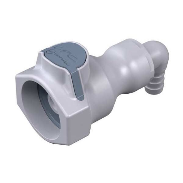 Quick Connection Coupling, Application Chemical, Fitting Side A Connection Type Coupler, Fitting Side B Connection Type Barbed, Fitting Side B Tube Inner Diameter 3/8 in, Flow Control Type Shut-off, Fitting Material Polypropylene, Overall Length 3 1/4 in, Specific Fitting Shape 90 Degrees Elbow Coupler, Material Grade Not Applicable, Standards NSF, Color Gray, Compatible Tube Hardness Not Applicable, Compatible Tube Material Not Applicable, Compatible Tube Wall Thickness Not Applicable