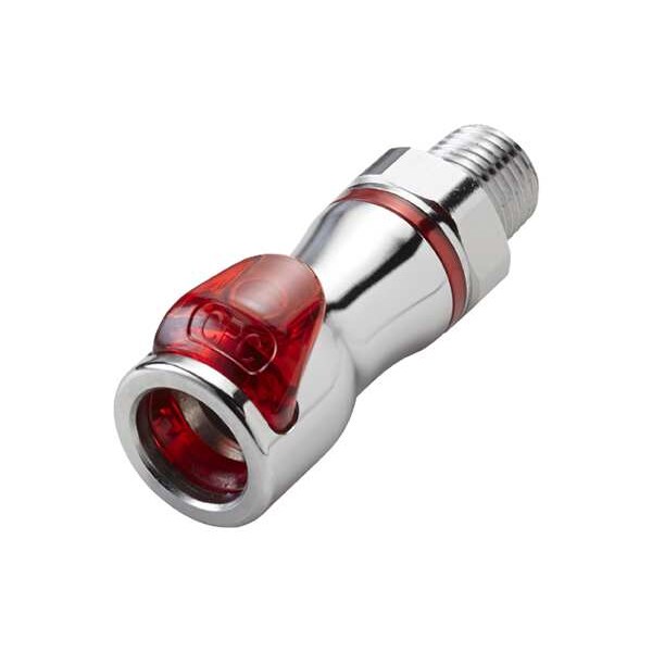 Quick Connection Coupling, Application Dielectric Coolants, Glycol/Water Coolants, Fitting Side A Connection Type Coupler, Fitting Side B Connection Type NPT, Flow Control Type Shut-off, Fitting Side B Pipe Size 1/4 in, Fitting Material Brass, Overall Length 2 3/8 in, Specific Fitting Shape Straight Coupler, Finish/Coating Chrome, Material Grade CA360, Standards REACH, RoHS, Color Warm Red, Compatible Tube Hardness Not Applicable, Compatible Tube Material Not Applicable