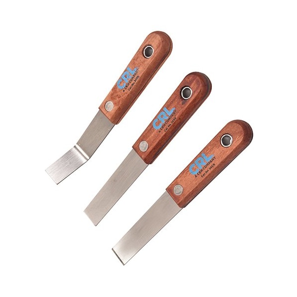 The CRL 3/4 in. Stiff Steel Putty knives are made with a .04 in. 1 mm thick stainless steel blade that is tightly fastened to the wood handle and held by an eyelet rivet making them easy to hang for storage. They come in three different styles : a Bent Knife with a 35 Deg radius bend, a Chisel Edge, and a Flat Edge Scraper. These are great narrow tools perfect for smoothing or scraping in tight spaces. The blade width is 3/4 in. 19 mm and the overall lengthis 6-1/2 in. 165 mm. Sold individually or in a set.Product WarningAlways wear appropriate eye and hand protection. NOT FOR SALE IN AUSTRALIA.Most shipping weights are approximate and have not been verified. If the exact weight is needed in order to determine shipping costs, and shipping costs are required in order for you to complete your order, please request this prior to submitting your order by contacting CRL Customer Service. Product images shown are of the actual product or a close representation. Colors can vary depending on your computer's video card and on how your monitor's color is adjusted.