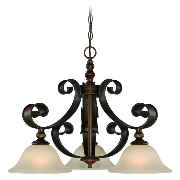 This Three Light Down Chandelier is part of the Seville Collection and has a Spanish Bronze Finish and Opal Glass.