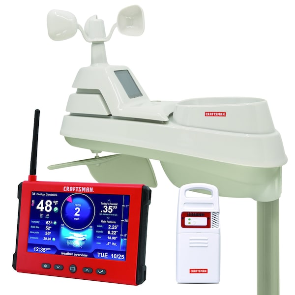 Always stay on top of the weather with your own CRAFTSMAN Personal Weather Station. Combining such tools as a wireless indoor/outdoor thermometer, an indoor/outdoor hygrometer, a wireless rain gauge, wind vanes, wind anemometers, and a barometer, this home weather station measures indoor and outdoor temperature and humidity, wind speed, wind direction, rainfall, and barometric pressure. Plus, it provides a personalized forecast 12 hours in advance from your current conditions, so you'll always know when inclement weather is ahead and when to move your outdoor plans inside. In addition to the outdoor measurements, the HD display exhibits the time, month, and date, making for the perfect weather clock for your workshop, tool shed, or garage! The included outdoor, weather-resistant lightning sensor tracks lightning strikes up to 25 miles 40 km away and provides a visual and audible warning, a feature only the best weather stations can boast. Both the 5-in-1 remote weather station sensor and lightning sensor require four 4 AA alkaline or lithium batteries each not included.