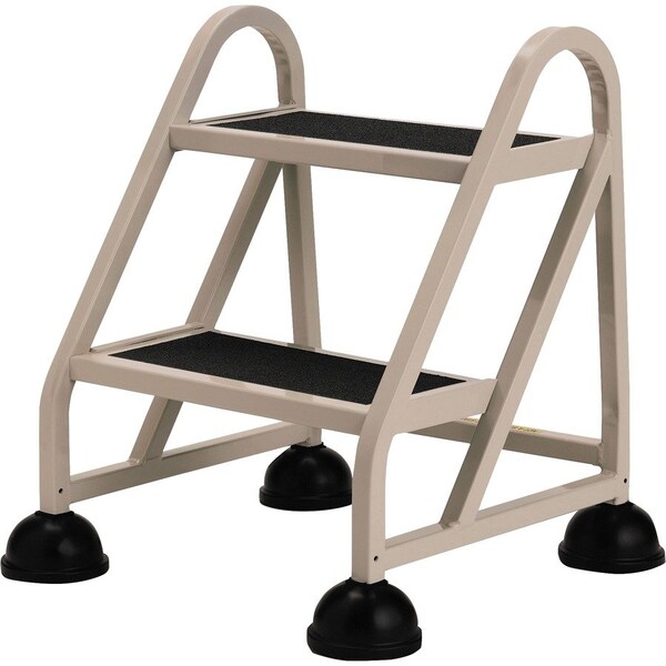 High-tensile, two-step aluminum ladder is welded for strength with visual appeal. The spring-loaded casters allow each lightweight ladder to roll where pushed and stop when stepped on. Ladder provides solid secure footing. Nonskid vinyl treads provide traction. Rubber bumpers protect other furnishings. OSHA/ANSI compliant ladder offers a 300 lb. load rating.