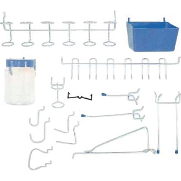 Fits standard 1/8 in and 1/4 in pegboard. Includes multi-tool holder rack, 4 in double arm hook organizer jars, parts trays, 6 in shelf brackets, 4 in double prong straight hooks, pliers holders, 2 in double prong straight hooks; 1-1/2 in straight hooks, 1/2 in and 1 curved hooks, peg locks and 6 in shelf brackets.