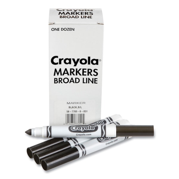 Order your favorite Crayola marker color in bulk! Conveniently packaged in a reusable tuck box, each set contains 12 of the same color. With its conical tip, the Crayola broad-line marker is a versatile drawing tool. Perfect for coloring in large areas, this marker is also great for drawing thin lines or dots. Kids can even create a ribbon effect with lines that taper from thick to thin. The broad-line marker lays down plenty of color and won't smudge or bleed through paper. Great for classrooms, art studios, and more!
