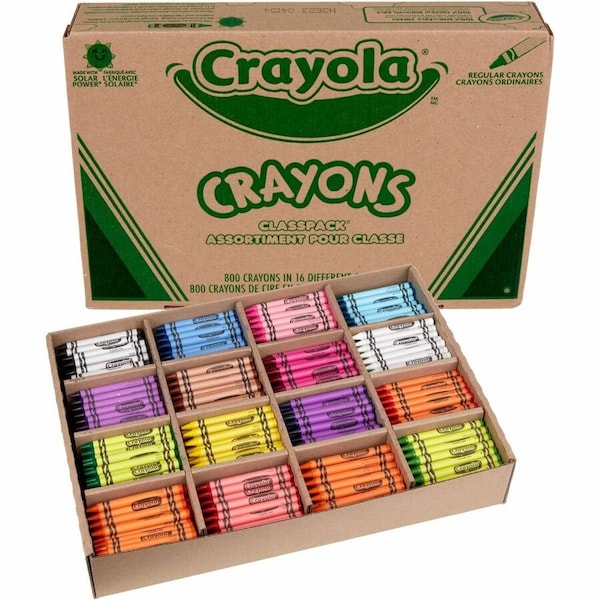 Classpack crayons make it economical to stock enough crayons for every student. The sturdy box storage is ideal for classroom use. Crayons offer a brilliant assortment with true hues and pigments and smooth, even laydown. 16 colors include red, blue, green, yellow, orange, violet, brown, black, carnation pink, yellow-orange, red-orange, red-violet, blue-violet, blue-green, yellow-green and white. Crayons are permanent and waterproof. Crayons are certified AP nontoxic.