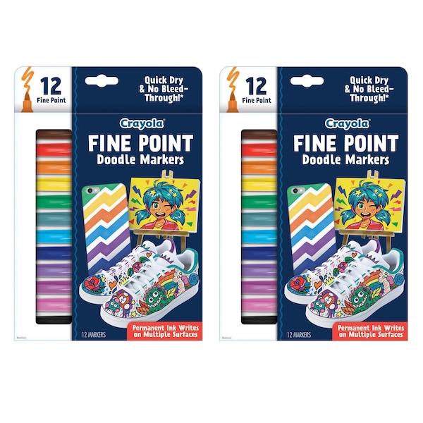 Define each and every detail of your next work of art with the Crayola Fine Point Doodle Markers. They are perfect for fine details and doodles, offering intense permanent ink that won't smudge or bleed through! Use them to practice creative lettering, detail handmade cards, decorate notebooks, bullet journal, and so much more. Whether you are stocking up on school supplies or replacing your marker set at home, these permanent markers are intended for aged-up artists. Pair them with coloring books for a bundled birthday gift. They are ideal for teens and adults, but safe for ages 8 & up. Each pack includes 12 markers. Sold as 2 packs for a total of 24 markers.