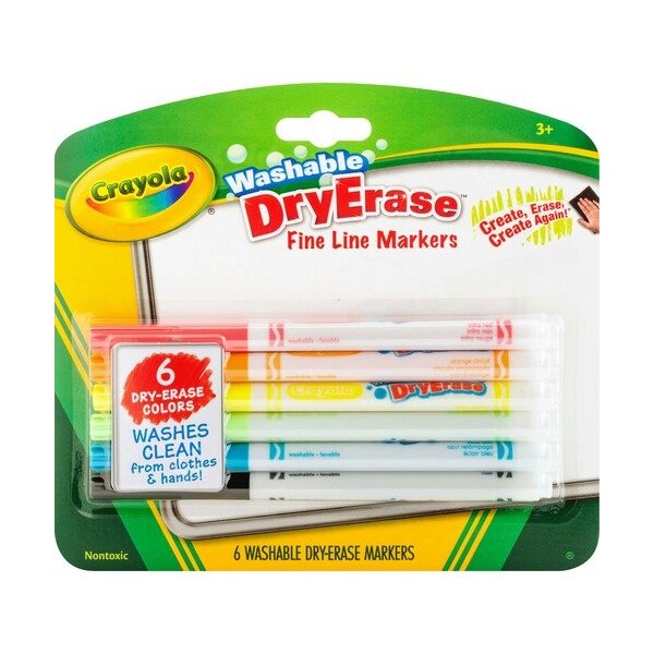 Create, erase and create again with bright, washable Fine-Line Dry-Erase Markers. Use at home, school or on-the-go. Fine-line, bullet tip is great for writing notes on smaller surfaces, organizing, and practicing letters and numbers. Marks erase easily and completely from virtually all dry-erase surfaces. They also wash clean from clothes and hands.