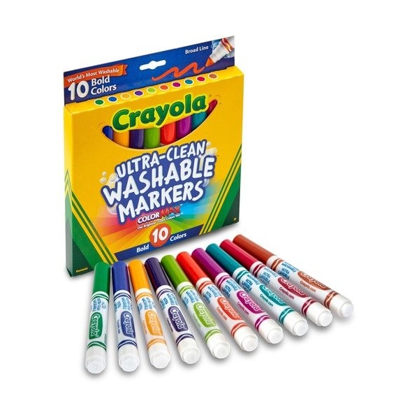 Ultra-Clean Washable Markers provide artists with eight tropical Crayola colors that feature Color Max for the most vibrant color. The variety of bright colors in this pack invites imaginative expression. With its conical tip, the Crayola Broad Line Marker is a versatile drawing tool. Perfect for coloring in large areas, these nontoxic markers are also great for drawing thin lines or dots. Children can even create a ribbon effect with lines that taper from thick to thin. Broad-line markers lay down plenty of color and won't smudge or bleed through paper. Ultra-Clean formula washes easily from skin, clothing and common household surfaces - even painted walls.