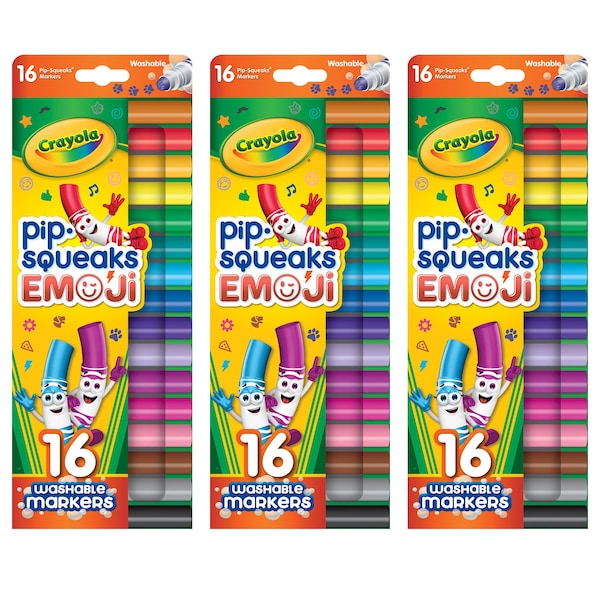 - •PIPSQUEAKS WASHABLE MARKERS: Sold as 3 packs for a total of 48 stampers, each individual pack includes 16 Crayola Pip Squeaks Stamper Markers featuring fun emotion icon stamps.