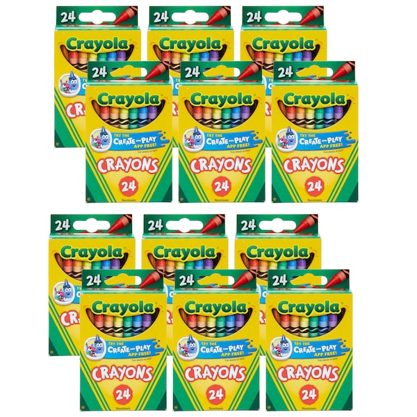 Crayola Crayons provide color-loving kids with 24 hues that feature vibrant, long-lasting color. Amp up school projects and artistic endeavors with high-quality results. The variety of bright colors in this pack invites imaginative expression. Kids will love to use these vividly colored, durable crayons at home or at school. Small enough to fit in a book bag, this portable box is large enough to hold a wide variety of colors. In addition to classic Crayola colors, this 24-count box contains fun shades so you can mix and match to create colorful drawings and bold signs. Crayola Crayons can last 35 percent longer, based on square foot coverage against key competitors. Children can enjoy drawing more pictures and filling coloring books even longer. Each box includes 24 crayons. Sold as 12 boxes for a total of 288 crayons.
