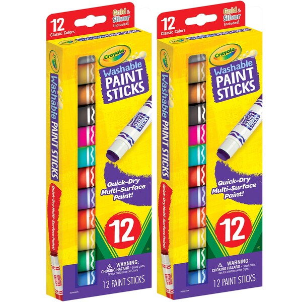 Enjoy the fun of painting with less mess! Each washable paint color easily washes from skin and washable fabric, making it great for young artists and their parents. Designed to work on a variety of surfaces, these convenient paint sticks provide full coverage and can be easily re-capped and stored for future use. Unlike traditional paints, Crayola Paint Sticks do not require water and dry in 60 seconds or less when used on poster board. Safe and nontoxic, these paints are ideal for adults and children, ages 3 and up. Each pack includes 12 Crayola Paint Sticks in assorted colors. Sold as 2 packs for a total of 24 paint sticks.