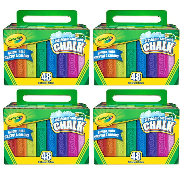 Go big and bold with Crayola Washable Sidewalk Chalk. Ideal for sidewalks and driveways, this set gets kids outside for artistic, imaginative fun. Create big, colorful murals and write large handwritten messages in vibrant shades. Draw brightly hued foundations for traditional chalk games, including hopscotch, tic-tac-toe, and four square. This set includes a diverse range of colors, from classic red, yellow, to the blue hues. These Crayola colors pop against sidewalk and driveway surfaces. A safe and convenient choice for kids, this chalk has a special anti-roll shape to prevent it from rolling down driveways or other inclined surfaces. Kids can keep their chalk close at hand as they draw fine lines and broad strokes. Crayola Washable Sidewalk Chalk washes clean from sidewalks and driveways. For fast and easy cleanup, use a water hose to spray away the color. Crayola art supplies and activities help children express, create, and connect through colorful play. Each box includes 48 Sidewalk Chalk sticks in exclusive Crayola crayon colors. Sold as 4 boxes for a total of 192 sticks of chalk.