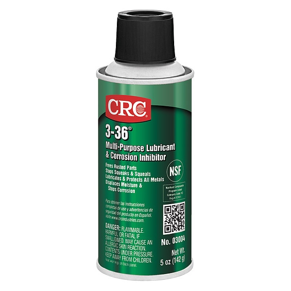 General Purpose Lubricant, Wet, CRC, 3-36, Net Fill 5 oz, Container Size 6 oz, Lubricant Container Aerosol Can, Petroleum Distillates, No Additives Primary Additive, Min. Operating Temp. -50 Degrees F, Max. Operating Temp. 250 Degrees F, NSF Rating H2 No Food Contact, 50 State VOC Compliant Yes, VOC Content 0 Percent, Lubricant Color Blue/Green, Odorless No, Flammable Flammability, Extremely Flammable Aerosol (Category 1), Flash Point 192 Degrees F
