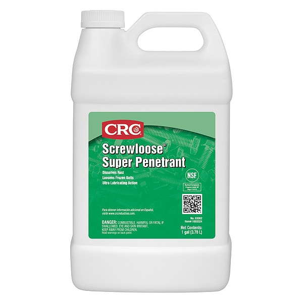 Penetrating Lubricant, CRC, Screwloose(R), Net Fill 1 gal, Container Size 1 gal, Jug, Petroleum Distillates, Min. Operating Temp. 32 Degrees F, Max. Operating Temp. 300 Degrees F, H2 No Food Contact NSF Rating, Yes 50 State VOC Compliant, 24.8 Percent VOC Content, Amber, Odorless No, Flammable, Combustible Liquid (Category 4), Flash Point 141 Degrees F, RoHS, NSF Registration #119115, USDA Certified Biobased Product No