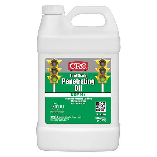 Penetrating Lubricant, CRC, Net Fill 1 gal, Container Size 1 gal, Jug, Mineral Oil, Min. Operating Temp. 32 Degrees F, Max. Operating Temp. 300 Degrees F, H1 Food Grade NSF Rating, Yes 50 State VOC Compliant, 0 Percent VOC Content, Colorless, Odorless Yes, Flammable, Combustible Liquid (Category 4), Flash Point 200 Degrees F, RoHS, NSF Registration #130545, USDA Certified Biobased Product No
